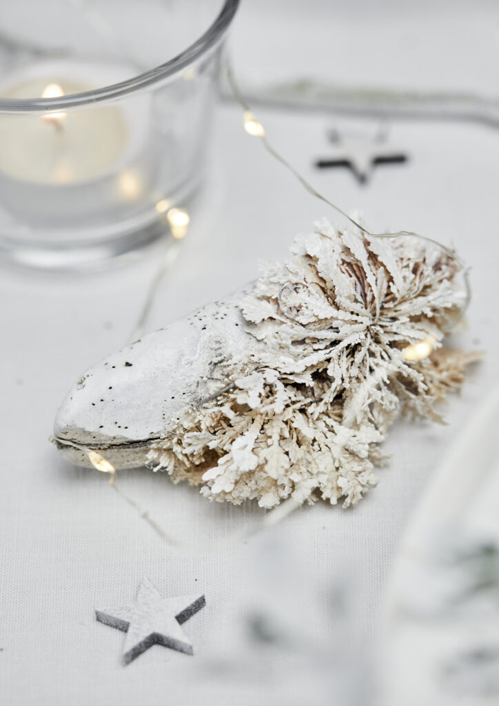 A fresh, seaside interpretation of the classic white Christmas begins with a foundation of relaxed, vintage-inspired style. Soft layers of white—from warm cream to the crispness of snow—blend effortlessly with coastal elements such as shells, pebbles and dried foliage, each unified by a pale, painterly palette. The result is a serene, tactile environment that sets the tone for an unforgettable festive celebration.