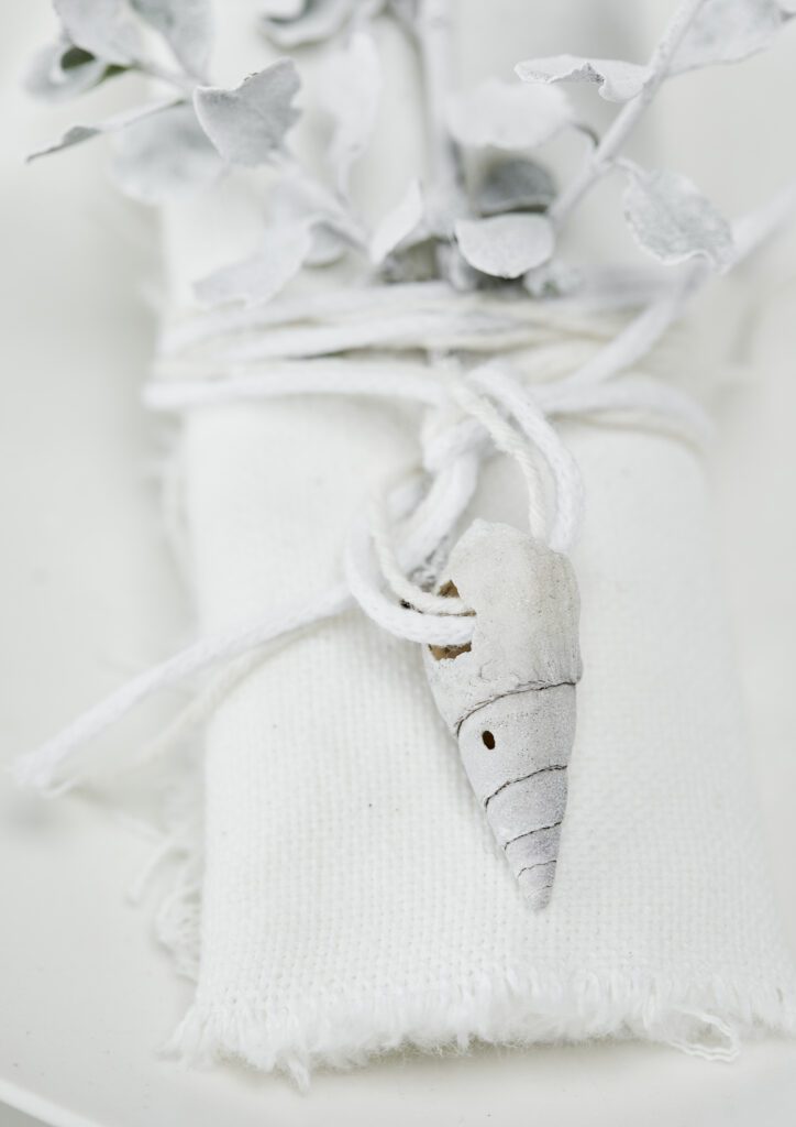 Gifts become sculptural objects within this palette, stacked and displayed like a minimal still life. Encased in simple white wrapping and bound with uncomplicated string, each parcel feels both understated and intriguing. Touches of coastal flora and snowy shells slip into the folds, adding subtle texture and reinforcing the natural, seaside mood. Together, the monochromatic tones create a beautifully restrained yet striking festive tableau.
