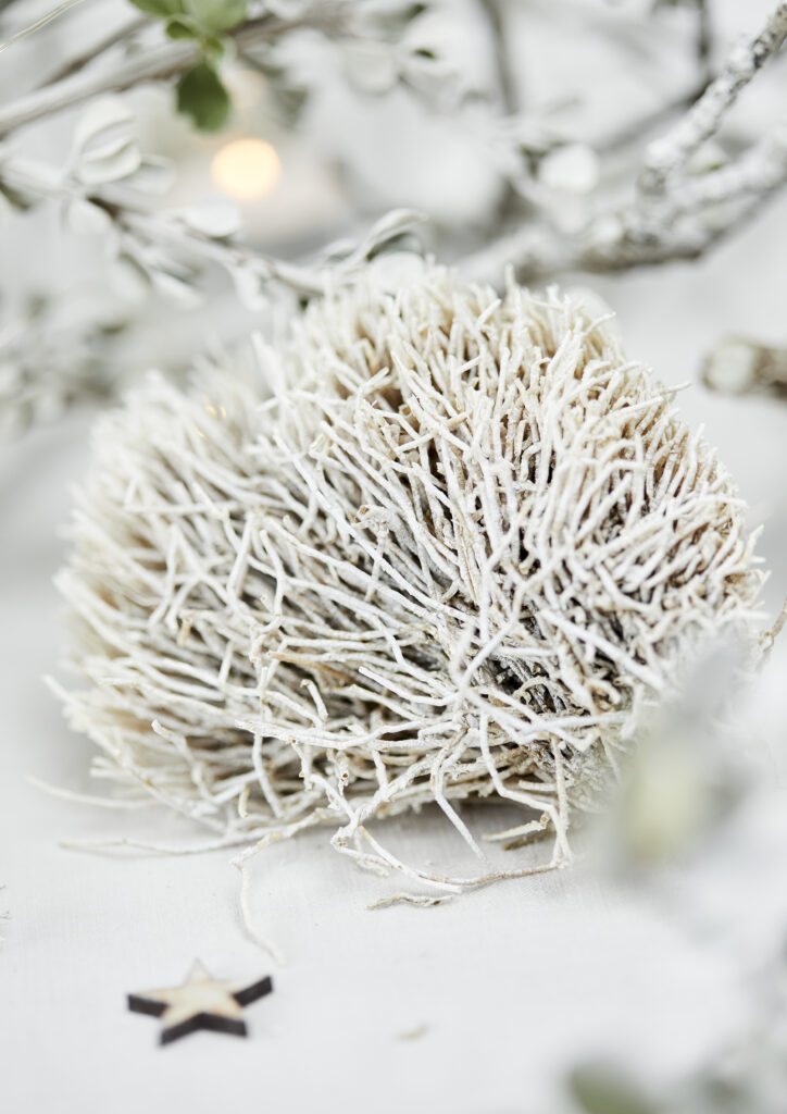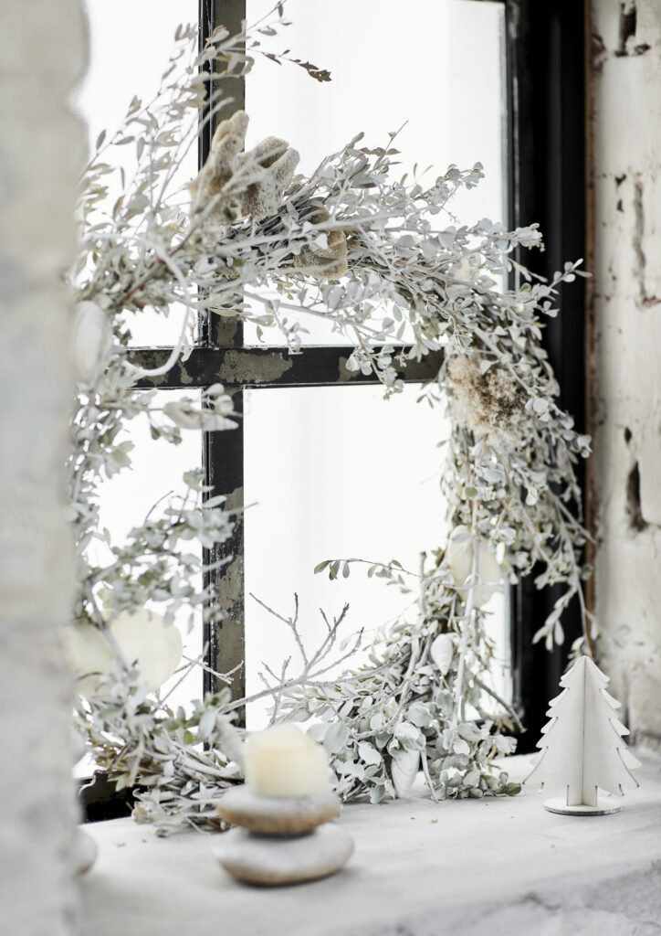 Wreaths are reimagined in delicate, airy forms throughout the home. Positioned on windowsills, hanging from doors or accenting bedside tables, they serve as quiet, elegant reminders of the season. Their fine leaves and slender shapes blend seamlessly with the overall palette, enhancing the atmosphere with subtle texture and timeless coastal charm.