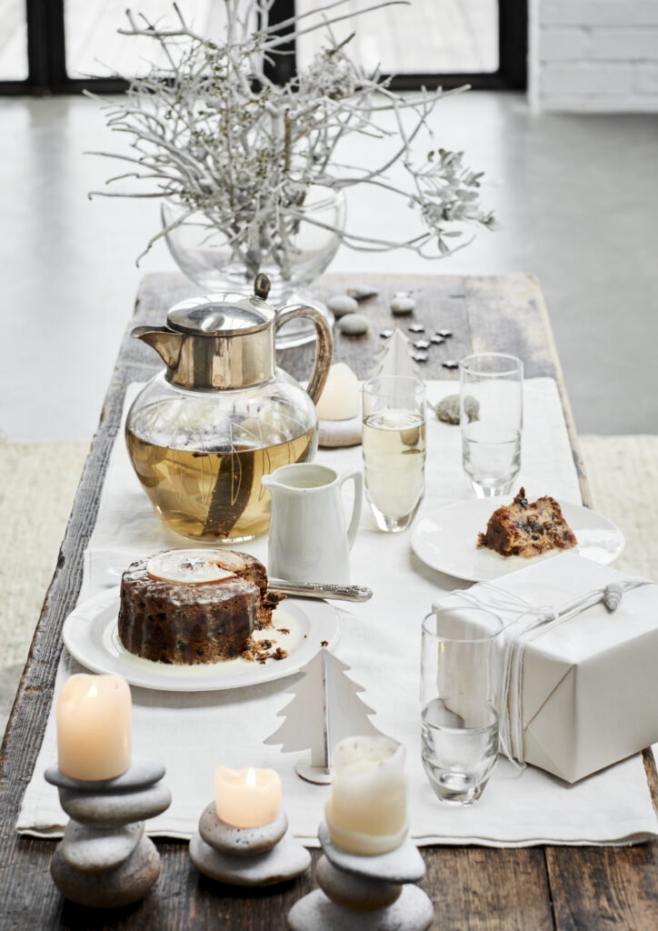 As the festivities unfold—whether during a slow exchange of gifts or after a generous Christmas feast—refreshing herbal infusions and spiced teas feel especially restorative. The scene glows with the soft illumination of pillar candles resting on smooth stacks of stone, while clear glass vessels filled with pale branches introduce a refined simplicity. Stemless glasses and pared-back serving pieces keep the mood modern, unpretentious and coastal at heart.