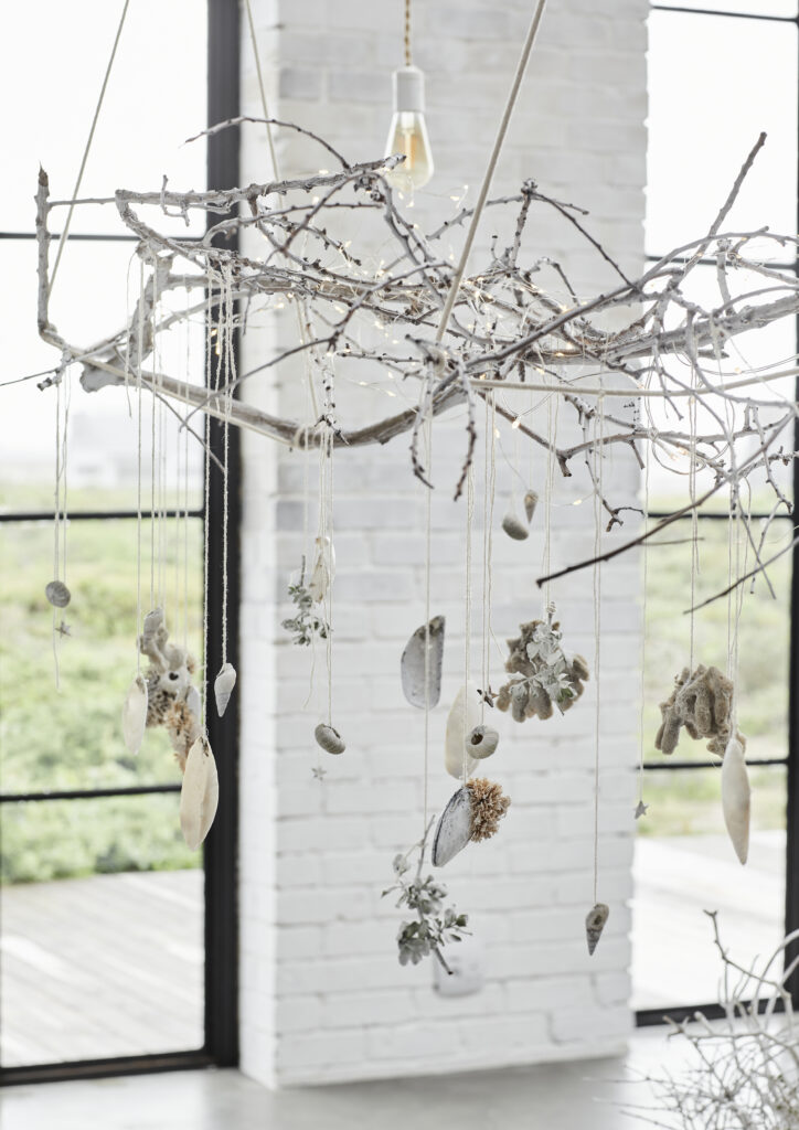 A whimsical take on the Christmas tree becomes a poetic focal point in this coastal setting. Delicate branches, bleached of color, hold a constellation of seaside finds—shells, smoothed pebbles and sun-worn fragments collected along the shore. Suspended gently overhead, they create a sense of quiet movement and childhood nostalgia. This floating centrepiece brings a dreamy, ethereal quality to the space where loved ones gather and exchange gifts, surrounded by soft textures that invite lingering: linen-covered seating, natural fibres, and comforting throws.