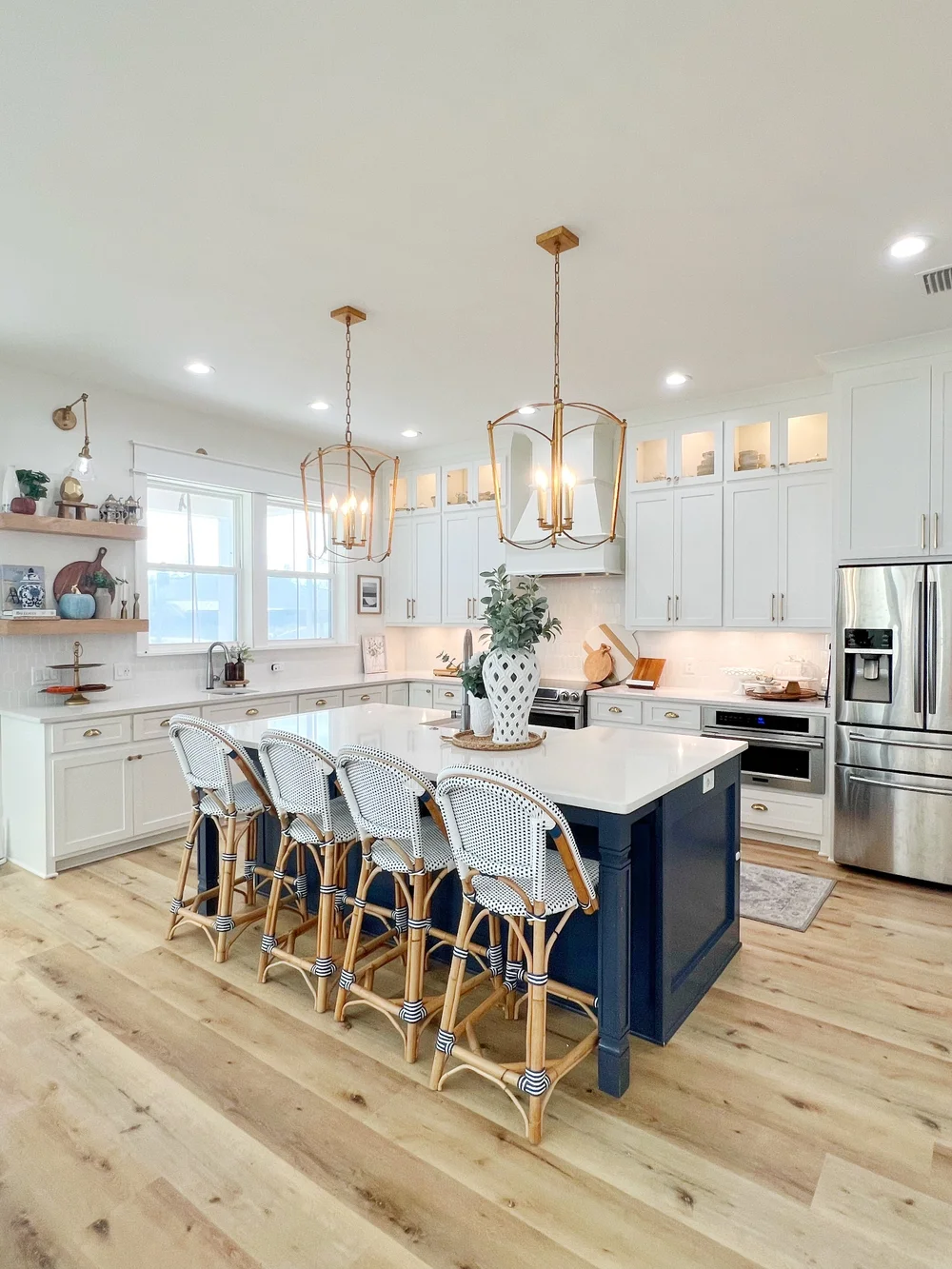 I wanted to keep our color scheme simple so I chose SW Pure White and BM Hale Navy accented by warm wood tones. My countertop preference was a clean white quartz that mimicked marble without bringing in any gray or heavy veining, so I went with MSI Quartz in Calico White. I chose a simple bright white picket tile design for the kitchen backsplash also grouted in white. My island pendants are two 16-inch brass lanterns with candle stick bulbs (which I LOVE). We used these color customizable LED can lights for our main source of lighting in the kitchen set on dimmers. Our cabinetry hardware is an all-Emtek mix of brass cup pull (in french antique) with satin brass hexagon knobs, and satin brass freestone pulls. My floating shelves came from this Etsy store. Above the floating shelves, Matt installed a brass swing arm light fixture to highlight that area. We have accent lighting in our glass cabinets and under cabinet lighting that is hard-wired in that came from our local lighting store. The beautiful seating around the island are the Serena & Lily Riviera stools in navy/white… and they are perfection.