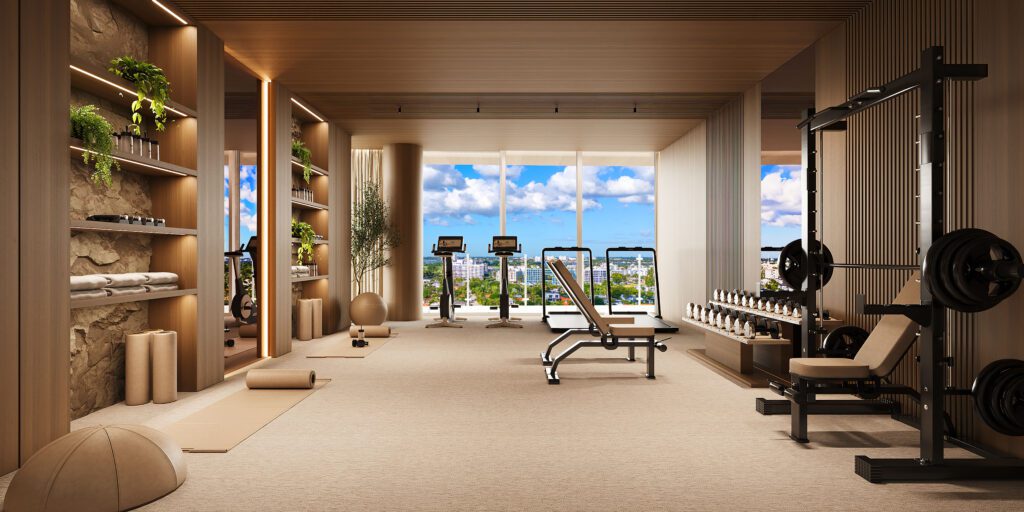 Beyond the main living spaces, the penthouse offers a suite of dedicated amenities typically reserved for private estates. These include an intimate cinema, a spa, a state-of-the-art fitness area with a private training room, and a game room complete with billiards and a bar. Above it all, the private oceanfront rooftop is conceived as a destination in its own right, with a pool, spa, expansive lounge areas, and a summer kitchen designed for dining and entertaining high above the shoreline.