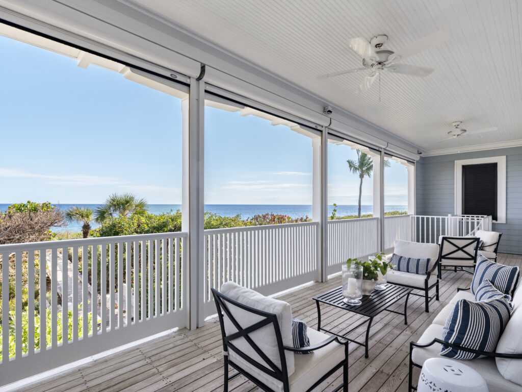 Floor-to-ceiling openings frame the dunes and ocean beyond, reinforcing the seamless relationship between interior spaces and the surrounding coastal landscape. The home’s architecture and interiors align with Windsor’s cohesive visual identity, an aesthetic language that carries through the community’s landmark structures, from the Beach Club to the Tennis Center.
