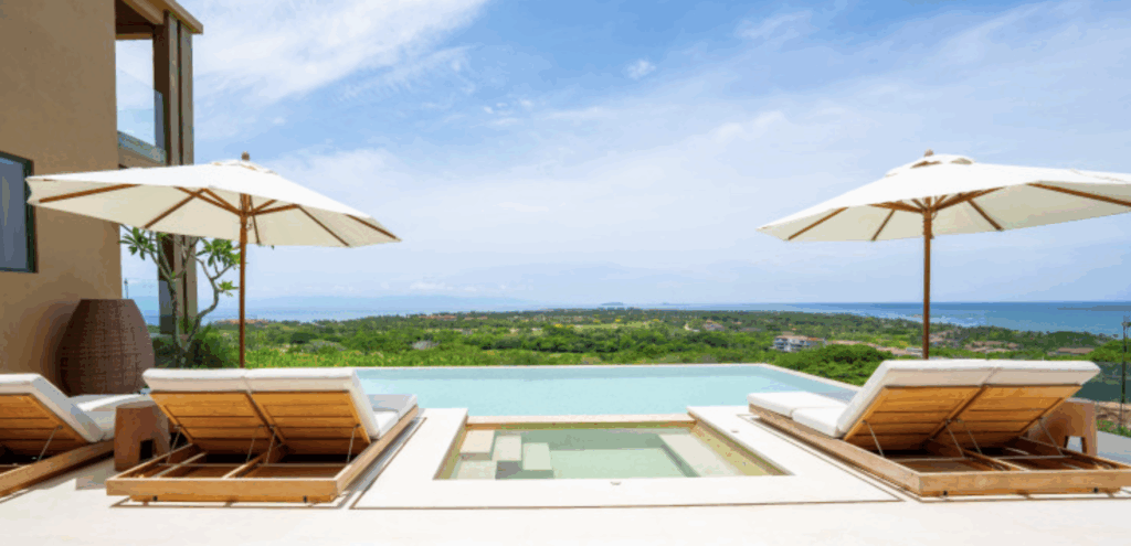 Sliding walls open fully to an expansive terrace overlooking the ocean, creating a breezy extension of the home’s interior spaces. Anchored by a private infinity-edge pool, the outdoor environment includes a shaded pergola, multiple lounge areas, and flexible spaces designed for long afternoons by the water, evening cocktails, or quiet sunrise coffee moments above the coastline.